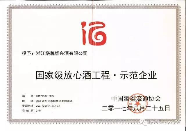 为在酒类行业树立正气,打击假冒伪劣的产品,营造健康的消费环境,使消费者可以喝到安全放心、优质的酒类产品。8月25日,中国酒类流通协会“国家级放心酒工程授牌大会”暨“企业信用评级授牌大会”召开, 浙江塔牌绍兴酒有限公司被授予“国家级放心酒工程·示范企业”的荣誉。