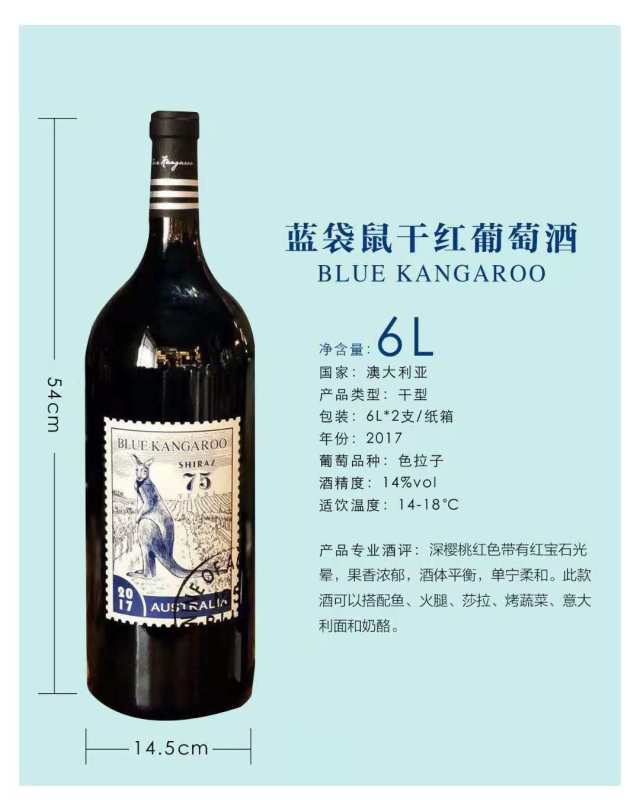 酒精度:14%、 产品类型:干型 规格:6L、 产地:澳大利亚、 年份:2017、 葡萄品种:色拉子、 适饮温度:14-18°C