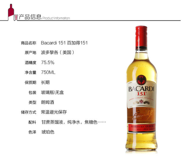 百加得151朗姆酒750ml
