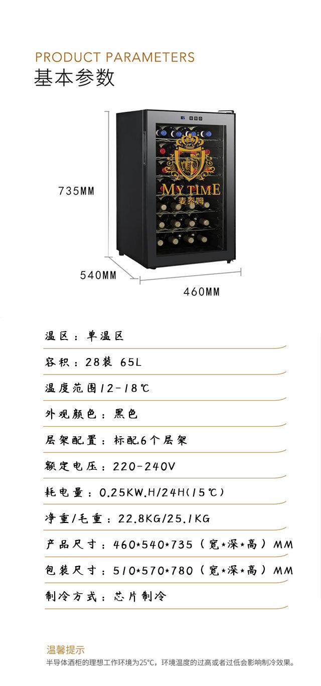 温区:单温区 容积:28装 65L 温度范围12-18℃ 外观颜色:黑色 层架配置:标配6个层架 额定电压:220-240v 耗电量:0.25kw.h/24h(15℃) 净重/毛重:22.8kg/25.1kg 产品尺寸:460*540*735(宽*深*高)mm 包装尺寸:510*570*780(宽*深*高)mm