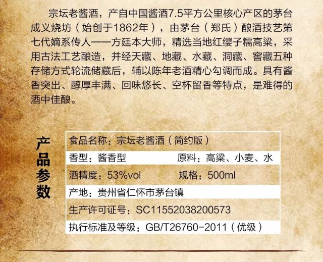 2瓶起免费配送 茅台镇传统佳酿--宗坛老酱(老包装) 酿造年份:2014年 罐装年份:2020年 净含量:500ml 酒精度:53%vol 原料:高粱、小麦、水 香型:酱香型 产地:贵州省仁怀市茅台镇