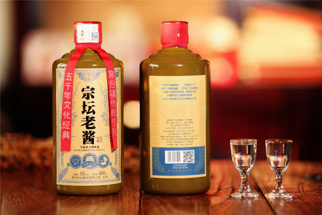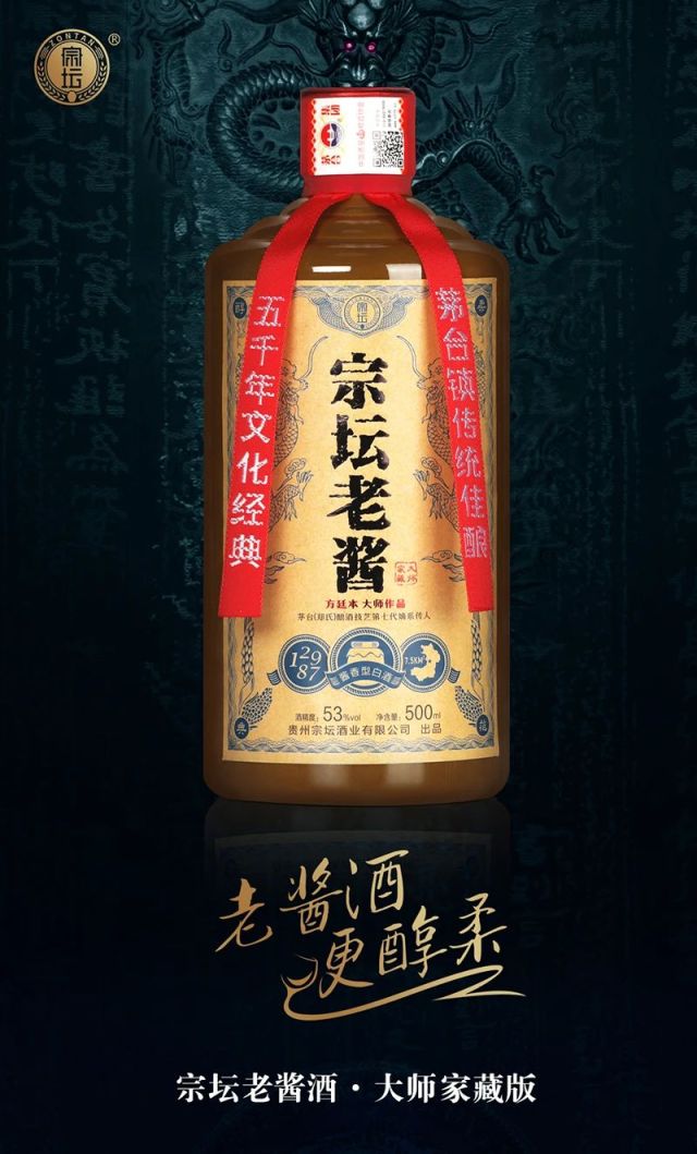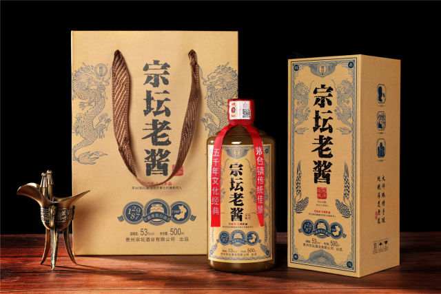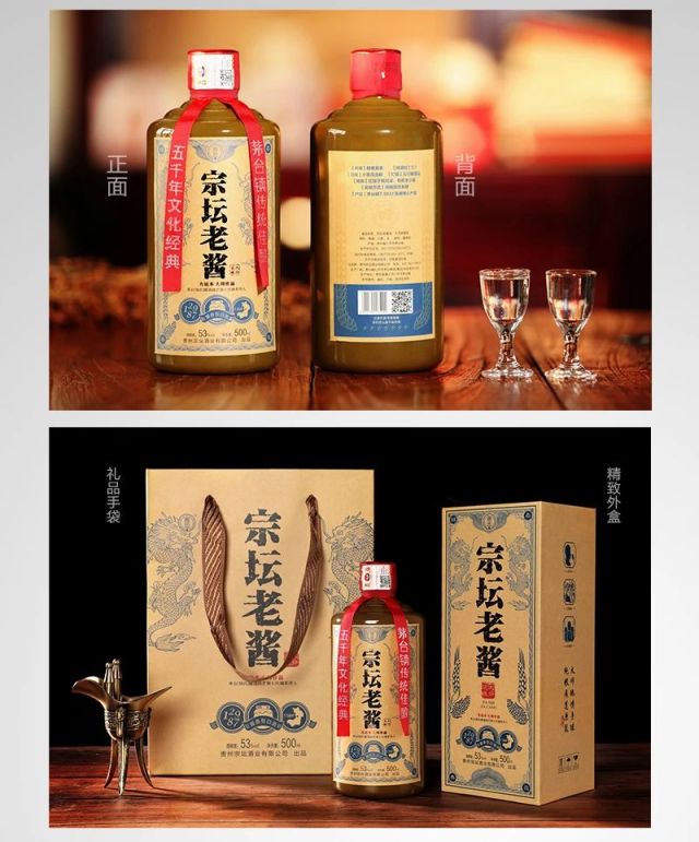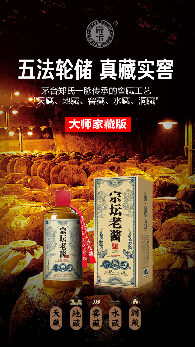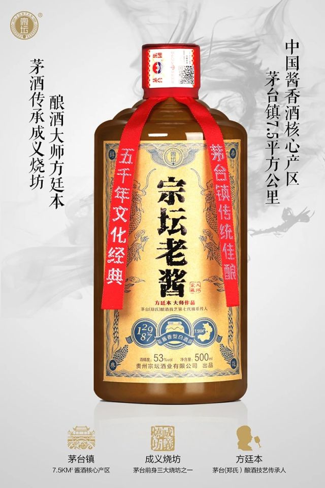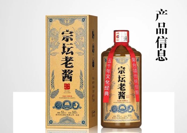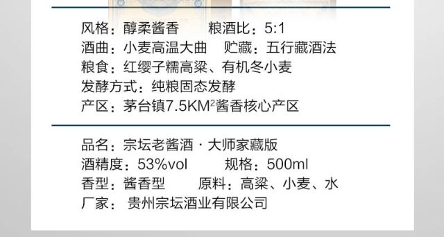 茅台镇传统佳酿--宗坛老酱(郑氏) 净含量:500ml 酒精度:53%vol 原料:高粱、小麦、水 香型:酱香型。 生产日期:2020年 产地:贵州省仁怀市茅台镇 【风格】醇柔酱香 【粮酒比】5:1 【酒曲】小麦高温曲 【贮藏】五行藏酒法 【粮食】红缨子糯高粱、有机冬小麦 【发酵方式】纯粮固态发酵 【产区】茅台镇7.5KM²酱香核心产区