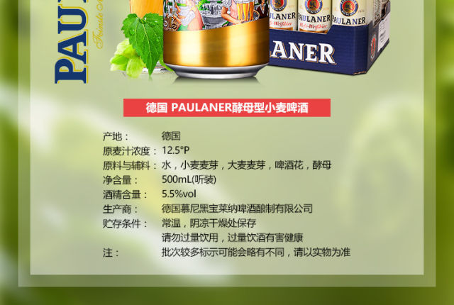 原产国:德国 净含量:500ml 系列:白啤酒 规格:500ml*24 原料与辅料:水、小麦麦芽、大麦麦芽、啤酒花、酵母 酒精度:5.5%vol 原麦汁浓度:12.5°P 保质期:12个月 贮藏条件:常温,阴凉干燥处保存.