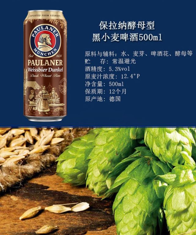 原产国:德国 原料与辅料:水、小麦麦芽、大麦麦芽、啤酒花、酵母 酒精度:5.3%vol 麦汁浓度:12.4°P 保质期:12个月 贮藏条件:常温,阴凉干燥处保存.