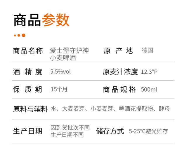 原产国:德国 原料与辅料:水、大麦麦芽、小麦麦芽、啤酒花提取物、酵母 酒精度:5.5%vol 原麦汁浓度:12.3°P 保质期:15个月 贮存条件:常温保存,置于阴凉处