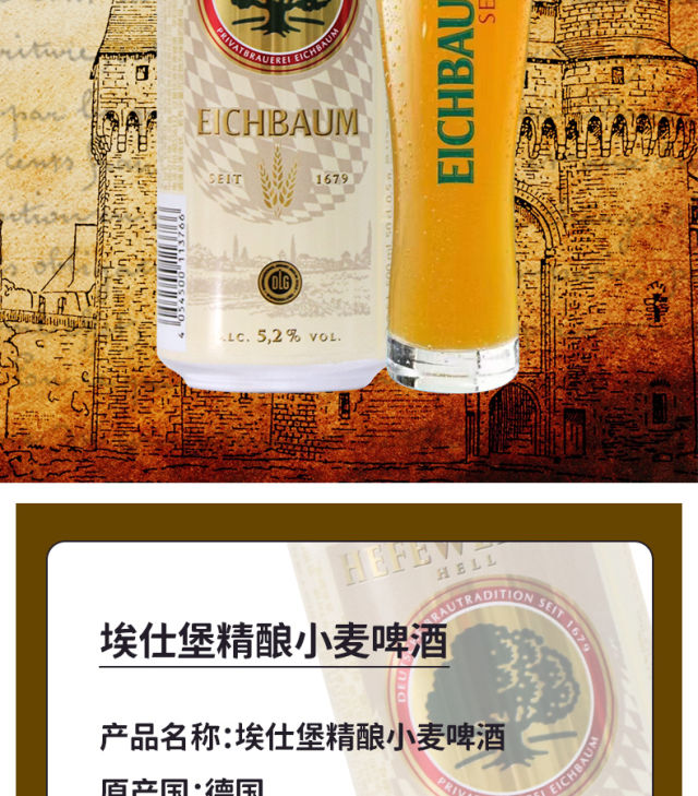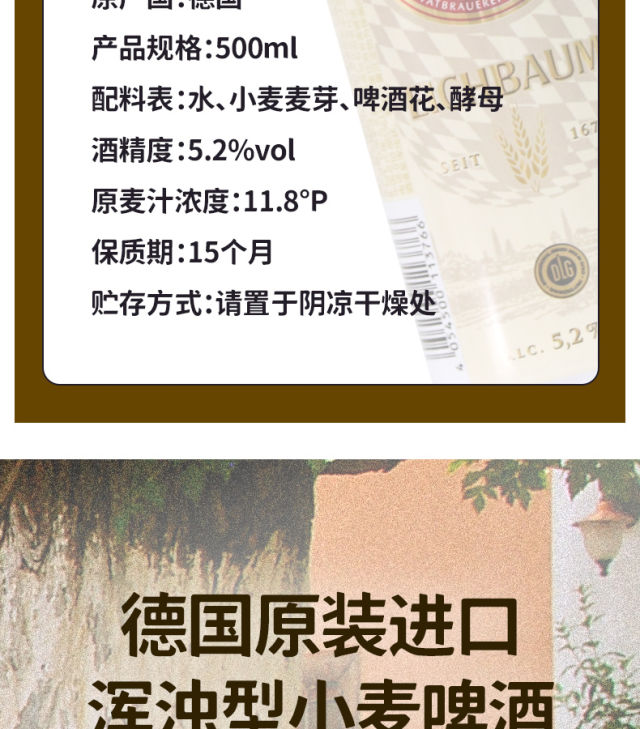 原产国:德国 原料与辅科:水、小麦麦芽、大麦麦芽、酒花浸膏、酵母 酒精度:5.2%vol 原麦汁浓度:11.8°P 保质期:15个月 贮藏方法:常温