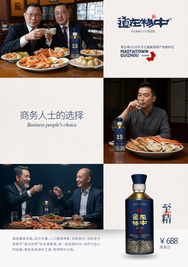 名称;道在·至精酒 配料:高粱.小麦.水 香型:酱香型 酒精度:53%VOL 净含量;500ml 贮存条件:通风.阴凉,干燥,清洁的条件下保存. 生产厂家:仁怀市酿丰酒业有限公司 地址;贵州省仁怀市茅台镇元木岩村 2瓶起免费派送