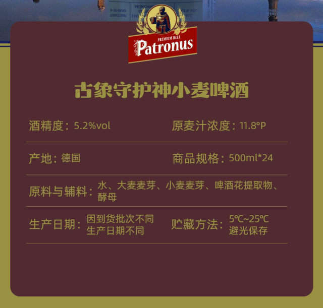 原产国:德国 原料与辅料:水、大麦麦芽、小麦麦芽、啤酒花提取物(啤酒花)、酵母 酒精度:5.2%vol 原麦汁浓度:11.8°P 保质期:15个月 贮存条件:常温保存,置于阴凉处