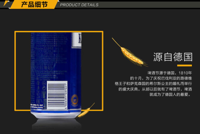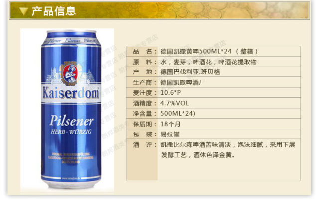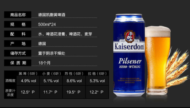原产国:德国 规格:500ml*24罐 系列:黄啤酒 原料与辅料:水、大麦麦芽、啤酒花、酒花浸膏 酒精度 :4.7%vol 麦汁浓度 :10.6°P 产品类型:淡色啤酒 贮藏条件:请置于阴凉干燥处,8℃~10℃饮用更佳.