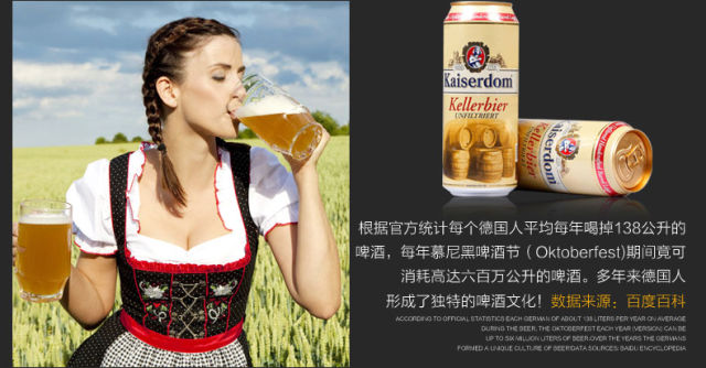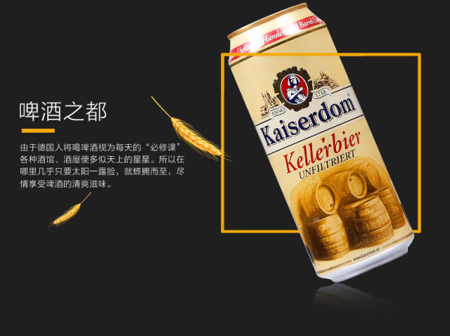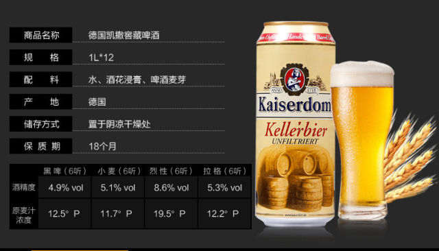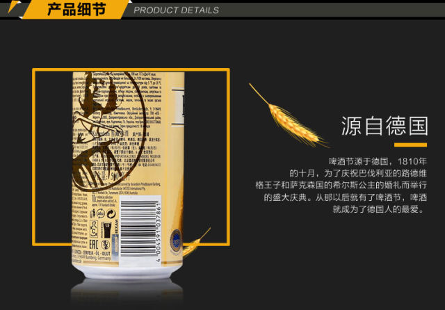 原产国:德国 箱规:500ml*24 分类:黄啤酒 原料与辅料:水、大麦麦芽、啤酒花、酒花浸膏、酵母 产品类型:浓色啤酒 酒精度:4.7%vol 麦汁浓度:11.4°P 贮藏条件:阴凉干燥处保存,8℃-10℃饮用更佳.