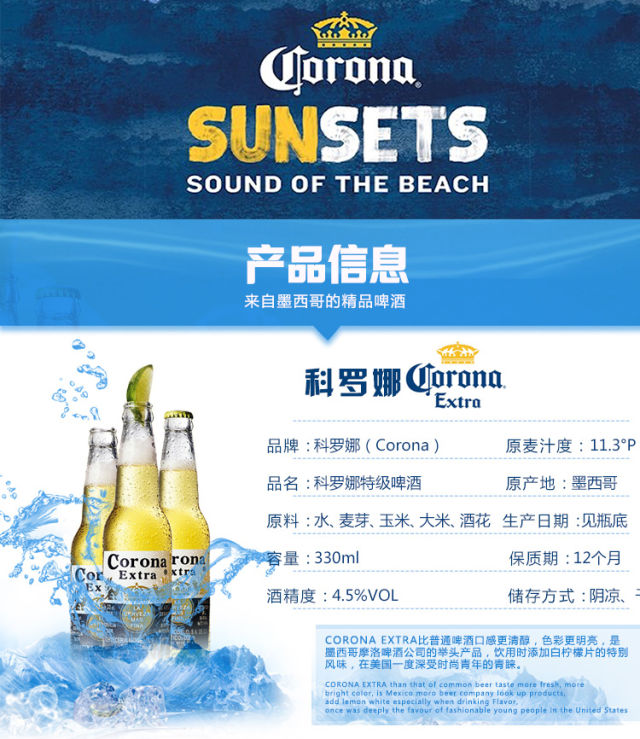 酒精度:4.5%vol、 规格:330ml*24、 产地:墨西哥、 保质期:12个月、