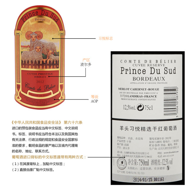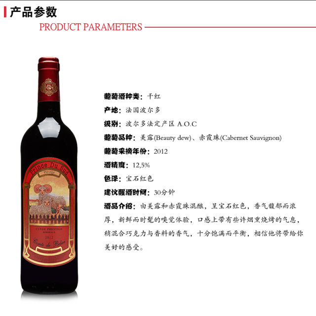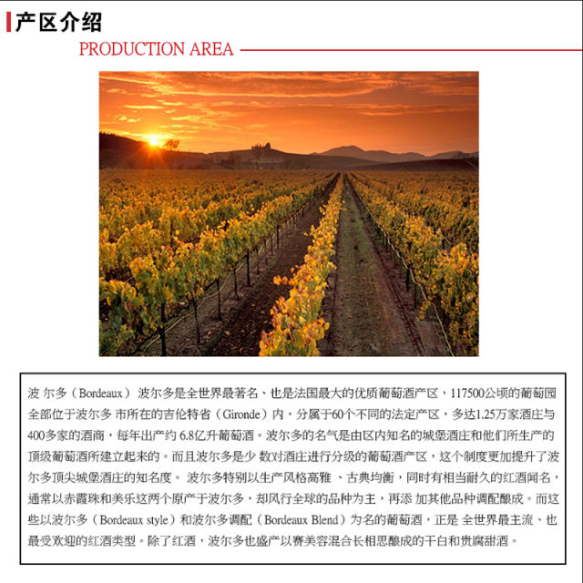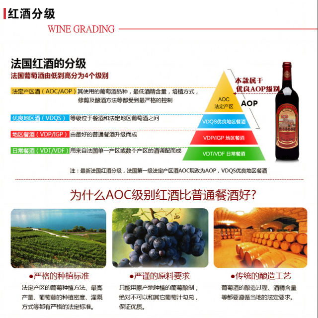 酒精度:12.5%、 箱装规格:750ml*6、 原产地:法国、 级别:AOP、 2瓶起免费配送